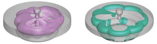 The flame fronts captured by these two models are presented in Figure 2. The flame front predicted with the SAGE model is presented in purple, while the flame front computed with the G-equation is presented in green. It can be seen that both the SAGE and G-equation models captured the asymmetrical initiation flame front due to the non-centered position of the spark plug. However, at the same crank angle degree (CAD), the propagation of the flame front captured by the G-equation was faster in the leaner main chamber, but the completion of combustion in the richer pre-chamber was slower. Figure 3 and Figure 4 further demonstrate the difference in the flame propagation rate. The main combustion process was completed at a much higher rate in the G-equation than in the SAGE model.