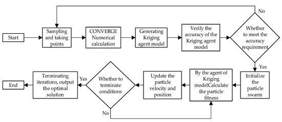 where is a spatial data point with n dimensions, the polynomial is the average value of the random process, and is the random distribution. In order to obtain a more accurate Kriging agent model, in this study, 50 models with different parameters were first randomly generated, numerically simulated, and calculated in CONVERGE software, and then a Kriging agent model was established from these 50 sets of values. After accuracy verification, the model was used for subsequent particle swarm optimization. The PSO algorithm is a classical and effective population intelligence optimization algorithm with a strong global search capability that was proposed by Eberhart and Kennedy in 1995 [39]. Each particle in PSO has two characteristics—velocity and position—and the optimization process of PSO is achieved by multiple iterations of the velocity and position, whose iteration equation is as follows: