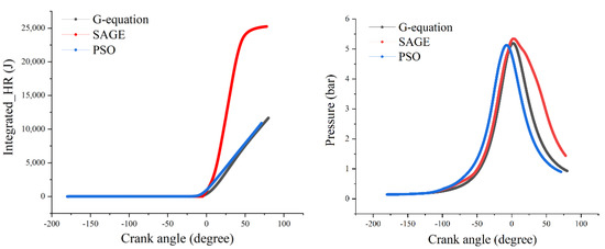 The heat release and pressure parameters of different models were studied quantitatively. In comparison to the SAGE model, one key benchmark value is the total heat release, which is the integration of the heat release rate. The engine’s performance was sensitive to the total heat release as well as the pressure for different crank angles, as shown in Figure 5. The model parameters after optimization by the PSO algorithm were: , , . Figure 5 shows a comparison of the SAGE and optimized G-equation models before and after.