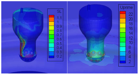 The laminar flame speed results are given in Figure 6, which is a function dominated by the mixing ratio of the fuel and air. Therefore, it can be found that the flame speed peaked at a contour, which denotes the intermediate mixing ratio region created due to the mixing between the injected gas and the lean environment. Figure 6 also shows the velocity fluctuation in the pre-chamber region. It can be seen that the values of the velocity fluctuation were very high near the nozzles, as expected. This means that the flame propagation across the nozzle was quick. Additionally, the high turbulent kinetic energy carried and injected into the main chamber not only improved the mixing process but also created a region for rapid flame propagation.