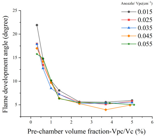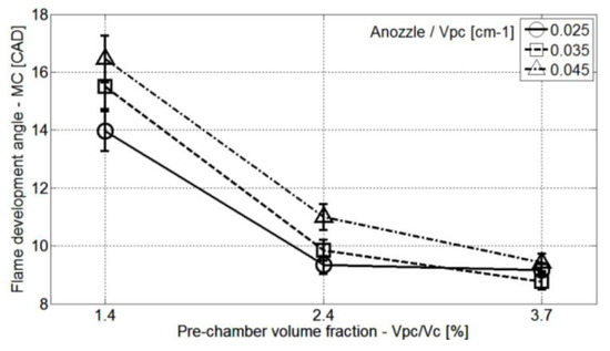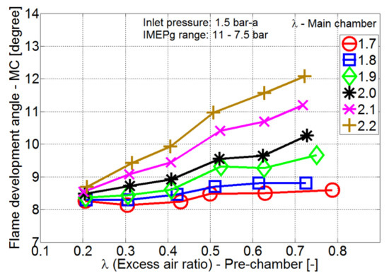 From the experimental investigations, the flame development angle (FDA) increased homogeneously with the pre-chamber lambda () and main chamber . The trend was less significant when the main chamber excess air ratio was about 1.7.