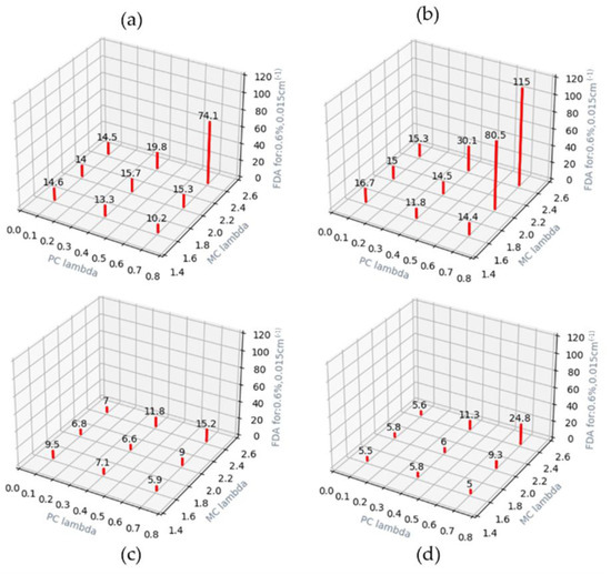 Extended range of simulations with different working conditions: (a) volume ratio 0.6%; nozzle area ratio 0.015 cm−1; (b) volume ratio 0.6%; nozzle area ratio 0.035 cm−1; (c) volume ratio 2.4%; nozzle area ratio 0.015 cm−1; (d) volume ratio 0.6%; nozzle area ratio 0.035 cm−1.
