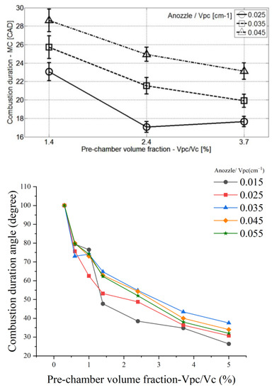 According to Ashish [35], it was found that with an increase in the pre-chamber size, there was a significant decrease in the FDA. The effects of different nozzle areas were better mixed. The decrease in the nozzle area increased the pressure difference, creating stronger jets that significantly increased the turbulent kinetic energy (TKE) in the main chamber and facilitating the mixing process. On the other hand, large nozzles ensured that the rich fuel entered the main chamber in time. This mixed trend was observed in both the actual experiments and the numerical ones. Furthermore, the combustion duration was also examined in this study. It can be seen in Figure 9 and Figure 10 that the simulation and experimental results also show good consistency.