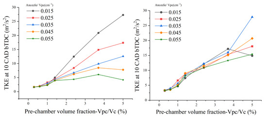In conclusion, despite some small discrepancies, the numerical simulation trends are generally in good agreement with the experimental results. The numerical model has a high reliability with regard to extending to a wider range of parameters and providing guidelines for future pre-chamber designs based on the simulation results. To study the optimal design of a pre-chamber, a test grid was designed, as shown in Table 2 (showing the volume and the area of each injection hole). Some of the results obtained are shown in Figure 10, showing the development speed and the completion time of the combustion. In addition, the TKE before and after the TDC were examined, as shown in Figure 11.
