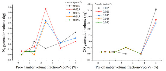 From Figure 11, we can see that a small-size nozzle created a large amount of turbulence, which facilitated the combustion process, as mentioned before. However, a tradeoff occurred between the TKE generation and the ability for mass transfers between the pre-chamber and the main chamber. Figure 12 plots the mixing ratio in the main chamber versus the volume ratio (Vpc/Vc). It was found that the mixing process became complex. In certain volume ratios greater than 2%, it can be seen that the mass exchange with the smallest area ratio of was sufficiently effective, while at other volume ratios, there were slightly larger optimal area ratio values. These results suggest that the optimal design of the pre-chamber should involve a trade-off between the volume and area ratios. In the present study, we mainly focused on characterizing the behavior of combustion in response to different pre-chamber parameters. In addition to the combustion characteristics, the pollutant emissions were investigated as well. This is an important indicator of performance in design; when the engines are scaled up and used in the replacement of diesel engines, the amount of pollution created can be significantly reduced. Hence, we also considered the exhaust gas to be one of the aspects to be included in the performance. In Figure 13, it can be seen that the two main exhaust gases were CO and NOx. The consumption of N2 gas approximately shows how much NOx pollution is generated. In Converge CFD software, C(NOx) = 2δ(C(N2)), where δ is a constant factor, is in the ideal state. However, the real situation often deviates from the ideal state, so the calculated emits will have some errors in relation to the actual emit, but this does not affect the overall trend.