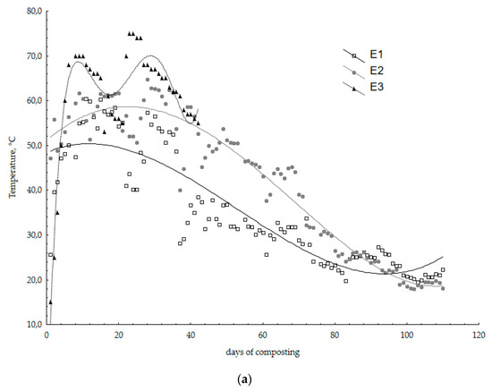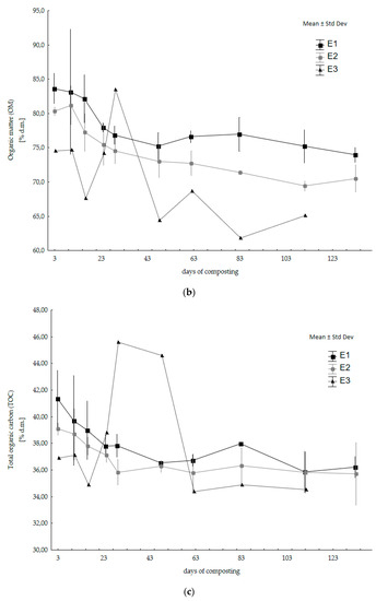 Organic matter content (OM) decreased in all three stages during the composting process (Figure 1b). The highest organic matter content at the initial composting phase featured the samples from the first composting stage (E1)—83.65%, whereas the lowest OM content value was noted for stage 3 compost—74.50%. In the last day of the composting process, OM content values were 73.95% (E1), 70.50% (E2), and 65.10% (E3). In E2 and E3, the highest OM loss was noted after the 16th day of the composting process, whereas in E1, it was after the 24th day. OM losses can be associated with the chemical composition of composted materials, particularly with fiber concentration. In compost windrows featuring different initial C/N ratios, loss of OM during the composting process was comparable [13,14].