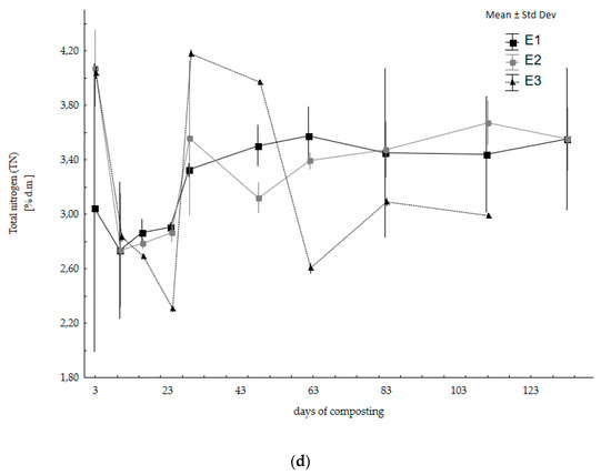 Change of total organic carbon (TOC) contents during the composting process manifested a similar pattern. The highest TOC value at the process beginning was noted in stage 1 windrows, at 41.35%, and the lowest value at stage 3, at 36.90% (Figure 1c). At the initial phase of the composting process the lowest total nitrogen (TN) value was noted for sewage sludge that had the highest initial values of C/N ratio (14.56), at 3.05% (E1). In those sewage sludge mixes with a reduced volume of straw (E2) and/or without (E3), initial TN content was 4.07% and 4.01%, respectively. TN content values noted during the composting thermophilic phase (up to the 24th day) decreased, which could be caused by liberation of NH4+ ions and emission of gaseous ammonia (NH3), which could increase odor onerousness (Figure 1d). At the final composting phase in those windrows that had the highest C/N ratio values, a slight increase of TN contents were noted. A slow increase of nitrogen concentration in compost at its maturity phase should be considered as beneficial due to the fertilizing values of this element [1,14,33].