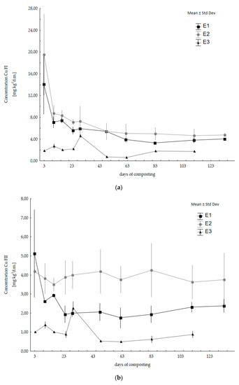 In all windrows featuring different initial C/N ratio values, the highest concentrations were noted for Cu compounds bound with the organic matter (FV). The results were in line with the well-known Cu affinity to organic substances, which contributed to the generation of humic substances and confirmed high Cu affinity to the –OH or –COOH humic substances functional groups [39]. The highest Cu content in particular fractions was noted for samples taken from the windrow of E2 whereas the lowest Cu contents were noted in samples taken from E3, which was influenced by the initial Cu content.