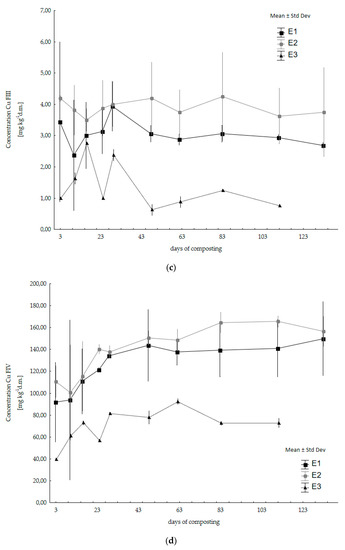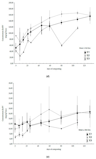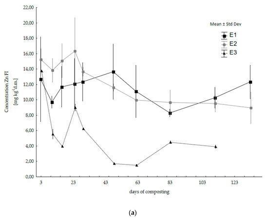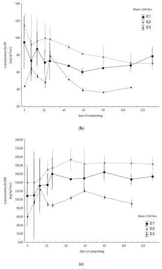 In tested compost samples of the 1, 2 and 3 stages, total Zn content increased from 358.75 mg kg−1d.m. to 465.70 mg kg−1d.m., 418.50 mg kg−1d.m. to 520.08 mg kg−1d.m., and 175.75 mg kg−1d.m. to 294.50 mg kg−1d.m., respectively. Total Zn content in produced composts did not exceed the admissible contents (800 mg kg−1d.m.) fixed for organic fertilizer and soil improvers [11]. The highest Zn content increase was noted in E3, where Zn content increased 1.7-fold compared with the initial content, whereas in E1 and E2 Zn content in compost samples taken at the terminal process phase increased 1.3- and 1.2-fold, respectively. Change of zinc compounds contents in particular fractions taken from windrows at the E1, E2, and E3 stages are presented in Figure 3a–e.