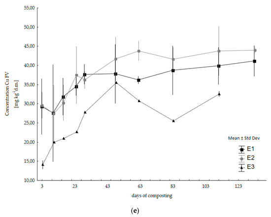 The average total copper content in sewage sludge used for composting purposes in E1, E2, and E3 amounted to 225.25 mg kg−1d.m., 252.25 mg kg−1d.m., and 216.75 mg kg−1d.m. respectively. Total Cu content in tested compost samples taken from E1, E2, and E3 windrows increased respectively from 144.25 mg kg−1d.m., 184.25 mg kg−1d.m., and 58.50 mg kg−1d.m. to 209.38 mg kg−1d.m., 239.83 mg kg−1d.m., and 122.50 mg kg−1d.m. Total Cu content in produced composts did not exceed its admissible values (300 mg kg−1d.m.) defined for organic fertilizer and soil improvers, which pertain to putting fertilizers on the market [11]. The highest Cu content increase was noted for E3, where Cu content increased 2.1-fold compared with the initial content, and the lowest increase of total Cu content (1.3-fold) was noted for E2. Similar results were noted in many research works and such an increase has been attributed to the loss of mass caused by organic matter decomposition, CO2, and water liberation, as well as mineralization processes [13,14,19]. The changes of copper compounds contents in particular fractions taken from windrows at the E1, E2, and E3 stages are presented in Figure 2a–e.