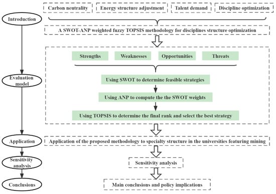 The rest of this study is organized as follows. Section 2 firstly explained the fundamentals about SWOT, ANP, and fuzzy TOPSIS, and then presented the proposed integrated methodology. The structure optimization of academic disciplines is discussed in Section 3 by taking the universities featuring mining as the research object. The sensitivity analysis is shown in Section 4. Finally, the conclusions of this study are given in Section 5.