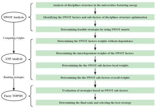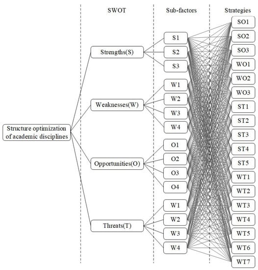 The SWOT analysis is a powerful strategic tool for strategy formulation and selection []. The method determines the best combination of strategies that maximizes strengths and opportunities and minimizes weaknesses and threats, and hence provides a good basis for the correct selection of strategies. Al-Haidous et al. made a SWOT analysis to identify the strengths, weaknesses, opportunities, and threats in liquefied natural gas supply chain []. Based on the SWOT method, high-level planning strategies are developed for Turkey’s power supply chain []. Wang et al. employed ANP and SWOT to explore the suitable reutilization methods for abandoned mines []. In this study, SWOT could be helpful for discovering the possible directions for discipline optimization. The SWOT analysis framework applicable to the specialty structure adjustment of the universities and faculties featuring energy is shown in Table 1.