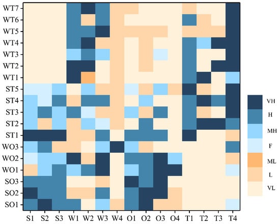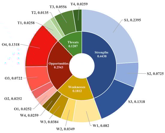 - Determine the interdependence among the SWOT factors and obtain the relative importance weight (). Then, the interdependence weight values of SWOT factors () are calculated.