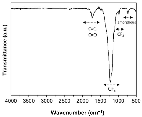 FT-IR analyses of the fluorocarbon coating deposited on silicon double-polished substrates were carried out with a FT-IR Bruker Vertex 70 V spectrometer. Spectra were collected, under vacuum, in the range of 400–4000 cm−1 over 32 scans with a resolution of 4 cm−1, and their baseline was subsequently corrected.