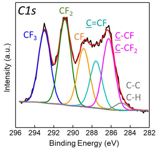 In order to gain deeper information on the surface chemical structure of the coating, the high-resolution C1s spectrum was curved-fitted and the results are shown in Figure 2. The spectrum is broad, as typically obtained by plasma polymerization, and reveals the presence of several functional groups: C-C/C-H (284.8 ± 0.2 eV), C-CF/C-CF2 (286.4 ± 0.2 eV), C=CF (287.8 ± 0.2 eV), CF (289.0 ± 0.2 eV), CF2 (291.0 ± 0.2 eV) and CF3 (293.1 ± 0.2 eV) [49,51]. The presence of several fluorinated groups is due to the fragmentation of the C3F6 molecule in the plasma and to the ion bombardment of the film during growth. The F1s spectrum is peaked at 688.2 eV (spectrum not reported), in agreement with its covalent nature.