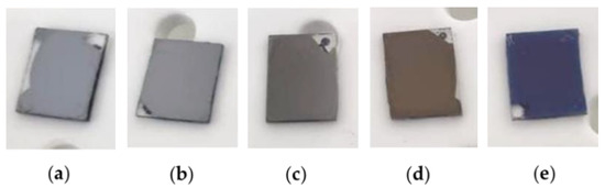 Photographs of: (a) pristine MAPbI3 film; samples obtained by the plasma deposition of the fluorocarbon coating performed for (b) 10 s, (c) 30 s, (d) 60 s and (e) 120 s on the perovskite.