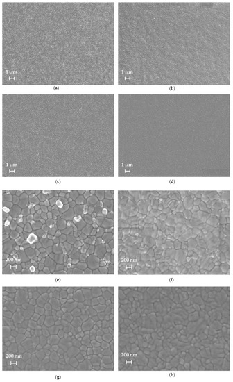 SEM images of: (a,e) pristine MAPbI3 film; samples obtained by the plasma deposition of the fluorocarbon coating performed for (b,f) 10 s, (c,g) 30 s and (d,h) 60 s on the perovskite.
