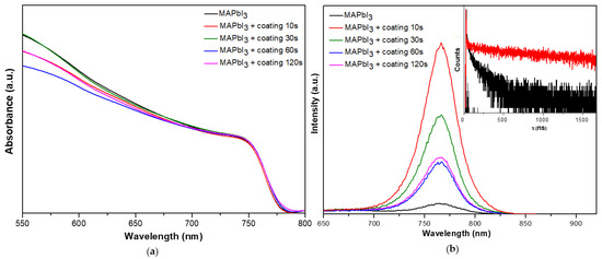 (a) UV-vis absorption spectra and (b) Steady-state PL spectra of pristine MAPbI3 film and of samples obtained by the plasma deposition of the fluorocarbon coating performed for 10 s, 30 s, 60 s or 120 s on the perovskite. Inset panel (b) time resolved PL decay for MAPI3 film and 10 s treated ones.