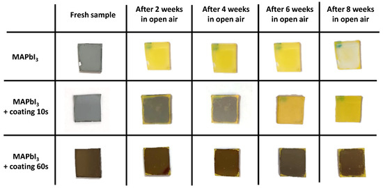 Photographs of pristine MAPbI3 film and of samples obtained after the plasma deposition (10 and 60 s) of the fluorocarbon coating on the perovskite at different times of exposure to open air (0–8 weeks).