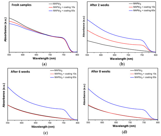 UV-vis absorption spectra of pristine MAPbI3 film and of samples obtained after the plasma deposition (10 and 60 s) of the fluorocarbon coating on the perovskite after (a) 0 week (i.e., fresh), (b) 2 weeks, (c) 6 weeks and (d) 8 weeks of exposure to open air.
