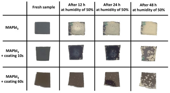 Photographs of pristine MAPbI3 film and of samples obtained after the plasma deposition (10 and 60 s) of the fluorocarbon coating on the perovskite at different times of storage (0, 12, 24 and 48 h) in a sealed glass chamber at humidity of 50% and temperature of 25 °C.