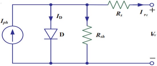 The current produced by the sunlight is parallelized utilizing the current source from a single-diode-modeled solar cell (SC), with the diode acting as a half-wave rectifier. The model is easy to implement due to its simplest form. However, this model does not give the required information regarding the solar cell’s parameters []. Figure 1 shows the equivalent circuit of a single-diode-modeled SC.
