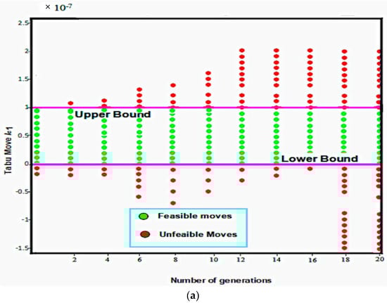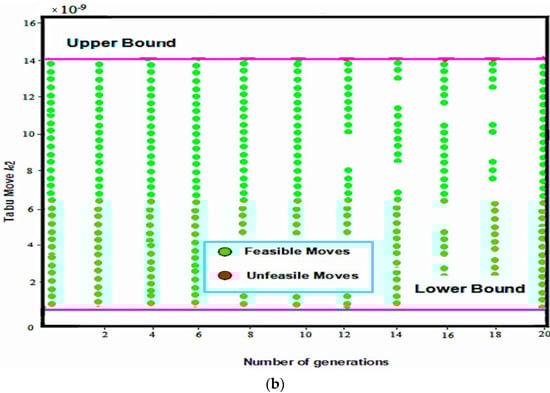 The upper-band and lower-band areas are described by feasible and unfeasible parameters. The number of generations is determined by the feasibility, as indicated in Figure 4a,b.