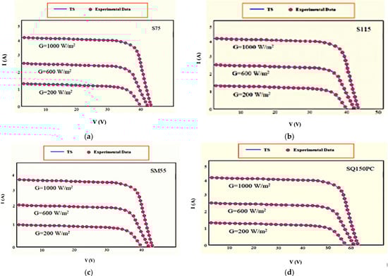I–V qualities obtained by utilizing TSO calculation and trial information. (a) S75, (b) S115, (c) SM55, and (d) SQ150PC.