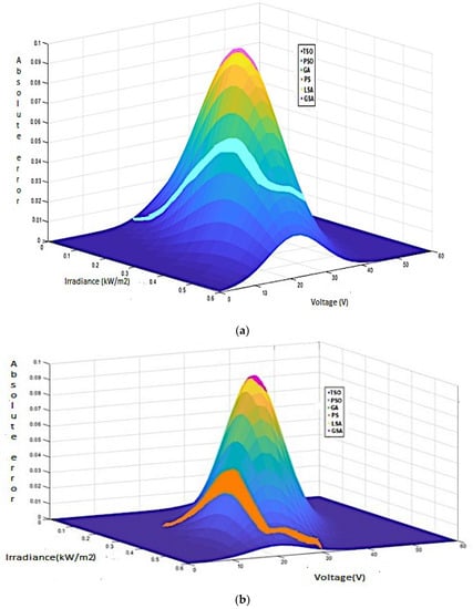Changes in absolute errors have a significant impact on the proposed TSO algorithm and current approaches under diverse irradiance patterns. Figure 7a,b illustrates the % absolute error on the mono-crystalline and multi-crystalline PV panels, respectively.
