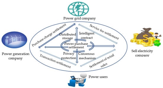 The application of blockchain technology in electricity bill settlement can efficiently realize a combination of the information flow, the energy flow, and the control flow, which can simplify the settlement process and improve the efficiency of electricity bill settlement compared with traditional methods. Figure 7 shows a schematic of the application of blockchain technology in the settlement of electricity charges [68]. Power grid companies, power generation enterprises, electricity sales companies, and electricity users can use the blockchain technology with distributed storage, consensus mechanism, smart contract, and privacy protection to carry out the settlement of electricity charges, transaction settlement, service fee settlement, and retail settlement. At present, studies on the use of blockchain technology in the settlement of electricity bills include the following: