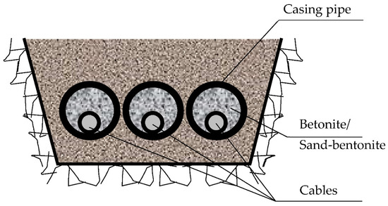 The electricity transmission in built-up areas, especially in urban agglomerations, is usually carried out using underground cable lines. The most common practice is to use underground cables placed in surrounding trenches. Figure 1 shows an example of an underground cable duct.