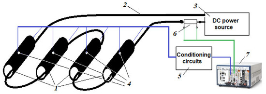 The main elements of the test stand: (1)—a set of casing pipes; (2)—a copper cable; (3)—a set of current power supplies; (4)—miniature hermetic thermistor sensors; (5)—signal conditioning circuits; (6)—shunt; (7)—PXI measurement system.