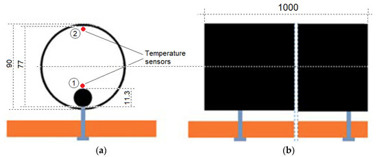 Attachment of the casing pipe and arrangement of sensors NTC 10 k in the pipe: (a) a cross-sectional view of the pipe; (b) a side view of a pipe section. The dimensions in the drawing are given in mm.