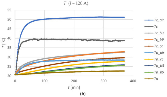 Temperature charts on the test stand: (a) with 60 A current in the cable; (b) with 120 A current.