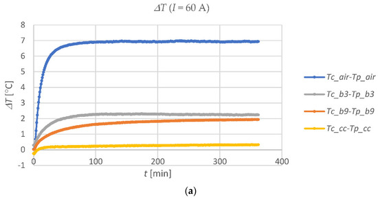The thermal time constants of the individual media in the casing pipes strongly depend on the value of their thermal conductivity. A greater time constant means the possibility of increasing the instantaneous permissible current carrying capacity of the cable line. This is due to the lower temperature variation of the cable, caused by the change in the current in the cable, than the temperature variation that would occur in the overhead line. The time changes of the differences ΔT between the temperatures indicated by the sensors placed in positions ➀ and ➁ (Figure 3) in each of the four casing pipes, after switching on the current in the cable, are shown in Figure 7. Figure 7a relates to 60 A, and Figure 7b to 120 A.
