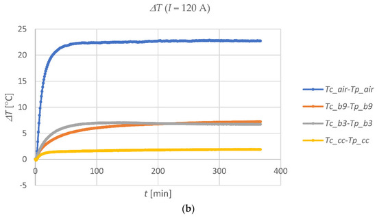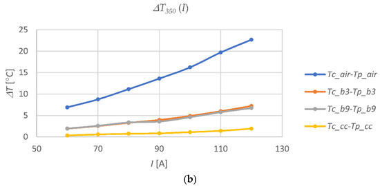The low temperature difference (Tc_cc-Tp_cc) in the casing pipe with CableCem means that energy is efficiently dissipated from the cable, reducing its temperature. In contrast, the large temperature difference (Tc_air-Tp_air) proves that the air in the casing pipe is a great barrier to energy dissipation. Figure 8 shows the temperature values at the considered points of the test stand, recorded for various currents at 350 minutes after switching on the current in the cable, and the corresponding temperature differences. At this point in time, all of the measured temperatures were close to the stabilized values.