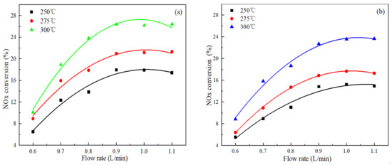 As shown in Figure 1a, the variation in NOx conversion with a flow rate of three temperatures was approximately the same. When the flow rate increased from 0.6 L/min to 0.9 L/min, the conversion efficiency of NOx significantly increased. Because the ratio of catalyst mass to gas flow rate was constant, the catalyst mass in the reactor also increased as the flow rate increased. With the increase in flow rate and catalyst mass, the contact area between gas and catalyst also increased, which reduced the diffusion process of reactants to the surface of catalyst. It was shown that at the condition of lower gas flow rate, the diffusion rate of reaction components from the main stream to the surface of catalyst was less than catalytic reaction rate, and the external diffusion was the reaction control step. When the flow rate was reached to 0.9 L/min, the external diffusion rate was increased with the increase in flow rate. The external diffusion rate was faster than the catalytic reaction rate. Therefore, the external diffusion was no longer the control step of catalytic reaction, the NOx conversion ability of catalyst seemed to be stable, and the external diffusion could be neglected.