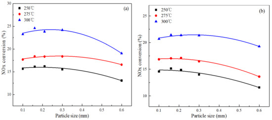 Effect of particle size on NOx conversion over the SOC and SSOC-5 (a) SOC, W/F = 0.9 kg·s·L−1, (b) SSOC-5, W/F = 0.36 kg·s·L−1.