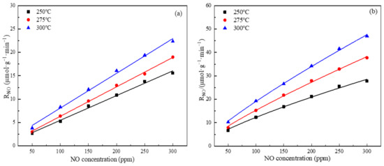 where, RNO is the reaction rate of NO in the reaction (μmol·g−1min−1), is the conversion efficiency of NOx (%), is the NO concentration (ppm), is the flow rate of gas in the feedstock (L/min), is the weight of the used catalyst (g).