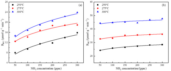 Figure 4 showed the effects of NH3 concentration on NO reaction rate. As shown in Figure 4a, the variety of NH3 concentration had a certain effect on the NO reaction rate. With the increase in NH3 concentration, more NH3 was supplied to the SCR DeNOx reaction, so the NO reaction rate gradually increased at all three temperatures. The NH3 reaction order of SOC for denitration was 0.36, 0.25 and 0.27 at 250 °C, 275 °C and 300 °C, respectively. In Figure 4b, the effect of NH3 concentration on the NO reaction rate over SSOC-5 was reduced compared with SOC, which indicated that NH3 could react faster on the surface of the catalyst. The NH3 reaction order of SSOC-5 was 0.09, 0.06 and 0.04, respectively, at 250 °C, 275 °C and 300 °C, which could be considered as 0.06. It could be concluded that the catalytic reaction was promoted by sulfuric acid modification. The decrease in the reaction order of SSOC-5 for denitration indicated that NH3 could participate in the reaction more quickly, which further proved that sulfuric acid modification improved the catalytic performance of SOC. The FTIR spectra results of SOC and SSOC-5 demonstrated that more Brønsted acid sites were generated on the surface of SSOC-5 [19], which further promoted NH3 adsorption on the catalyst surface.