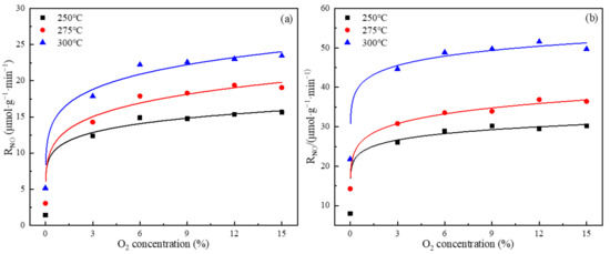 Effect of O2 concentration on rate of NO conversion: (a) SOC, W/F = 0.9 kg·s·L−1, (b) SSOC-5, W/F = 0.36 kg·s·L−1.