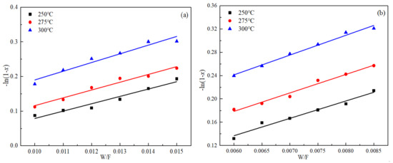 Trend chart of −ln(1 − x) with W/F at different temperatures: (a) SOC, (b) SSOC-5.