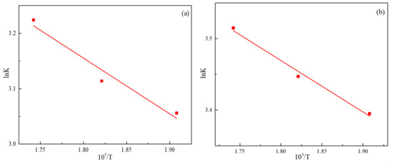 The relationship of lnK and 103/T (a) SOC, (b) SSOC-5.