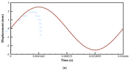 The forthcoming unloaded voltage Vul, unloaded cogging force Ful, loaded voltage Vl, loaded cogging force Fl, loaded power Pl and total loss L are root mean square (RMS) values. For a 5 mm stroke () at 60 Hz on an unloaded baseline case, the cogging force is aligned with the displacement and has a sinusoidal profile. Figure 5a shows this profile of displacement. It is evident that the vibration experienced by the translator is kept at a minimum state and ensures the stability of the machine. Figure 5b enumerates an induced emf Vul of 302 V with 146.9 N cogging force on the translator in Figure 5c. The induced terminal voltage for the loaded condition can be obtained from Equation (6)