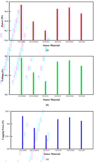Influence of magnet material on (a) induced power, (b) voltage, and (c) cogging force on the translator.