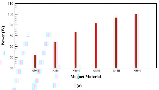 Neodymium-iron-boron magnets are the choice of permanent magnets for their high operable temperature and strong anti-demagnetization nature. The NXXH series of magnets N30H, N35H, N40H, N45H, N48H, and N50H are chosen for the magnetic material variation. The effect of change in magnet material has a significant and linear effect on the power. It is understood that maximum energy product increases the field and thus the induced emf in the coil. Figure 10a–c illustrate the influence of change in magnet material on power, induced voltage, and cogging force, respectively. From N30H-N50H, the cogging force has increased marginally. The baseline case produced a reasonable 96.8 W of power and N50H produced the 100 W mark. However, this comparison clarifies the availability of choice for magnetic material depending on the requirement of the application. To find a balance between power and cogging force, the baseline case is reasonable for the developed application.