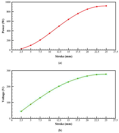 The most influential variation in the performance of PMLA is the stroke length. The stroke length is proportional to the induced emf, as mentioned in Equation (1). The average stroke length of the application varies from 3 to 6 mm. Hence, the reasonable 5 mm stroke is taken for the baseline case, and for the variation analysis, the range is from 2.5 to 25 mm with a 2.5 mm step incremental size. The inference can be observed in Figure 12a–c showing the power, voltage, and cogging force curves, respectively.