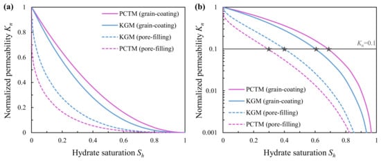 Sakamoto et al. [50] proposed a permeability model in the form of a piecewise function with different N values based on the Tokyo model according to the definition of a two-component system of hydrate, as illustrated in Figure 4a, in pore space, and this function was introduced into the developed numerical simulator by themselves. In the two-component system of hydrate, one component that coats the sediment grain surface is derived from irreducible water and the other component that forms inside the pore space is derived from free water. The Kn in the hydrate two-component system is expressed as follows: