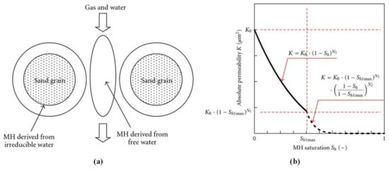 (a) Schematic diagram of hydrate two-component system; (b) formulation of permeability as a function of hydrate saturation in the two-component system. All rights reserved [50].