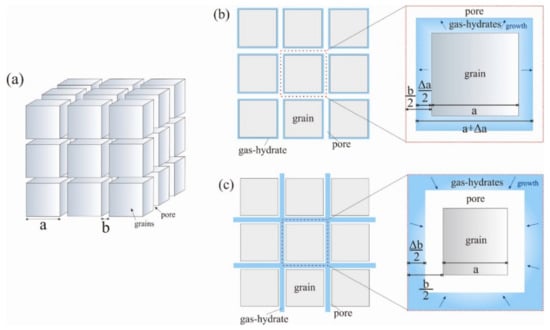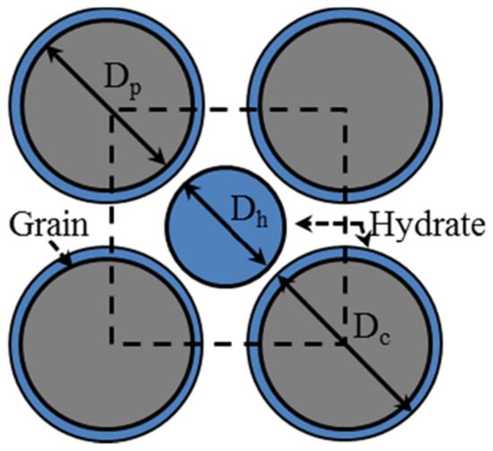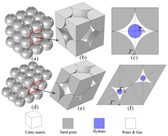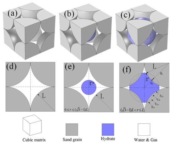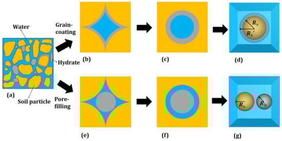 The study of the permeability of hydrate sediments is more complicated but more attractive and interesting than other types of sediments due to the existence of hydrate in the pore. Kleinberg et al. [23] provided two porous media conceptual models simulating different microscopic pore geometry and pore space characteristics of porous media and considering two idealized pore habits of hydrate in pore space, to quantify the relationship between normalized permeability (Kn) and hydrate saturation (Sh). A schematic diagram of the pore geometry of HBSs with different hydrate pore habits is shown in Figure 1.